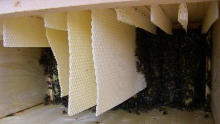 Ist der Schwarm vollständig eingezogen, bildet sich in der Bienenkiste eine schöne Traube und das Volk beginnt mit dem Wabenbau. Von hinten lässt sich täglich ein Blick auf den Baufortschritt und die Entwicklung des Volkes werfen ohne das Volk sehr zu stören.