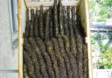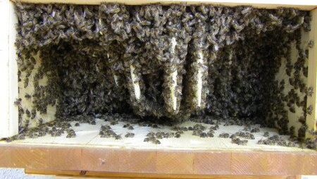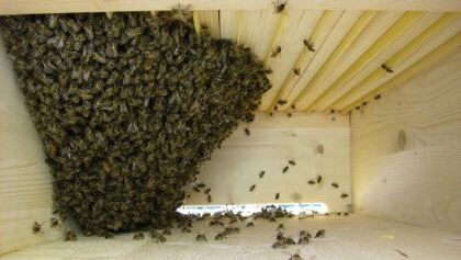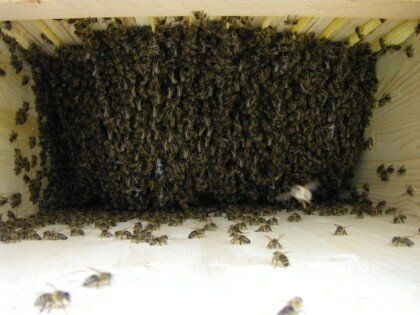 Ist der Schwarm vollständig eingezogen, bildet sich in der Bienenkiste eine schöne Traube und das Volk beginnt mit dem Wabenbau. Von hinten lässt sich täglich ein Blick auf den Baufortschritt und die Entwicklung des Volkes werfen ohne das Volk sehr zu stören.